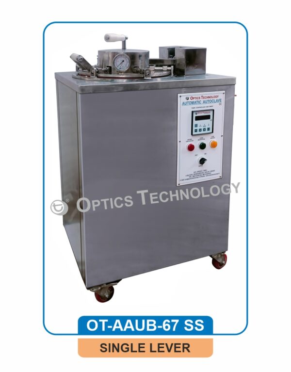 The chamber is absolutely leak proof and can be operated at any Selected point in between 5 to 20 pounds per sq. Inch. It is provided with pressure gauge, pressure release valve, S.S. Basket, safety valve, water level indicator with cord, Plug & Pressure Control Switch. It is provided with Radial Locking System with Automatic Water Level cut off device for element as a safety feature and Digital Temp. Controller Cum Timer. Temperature Range 121ºC